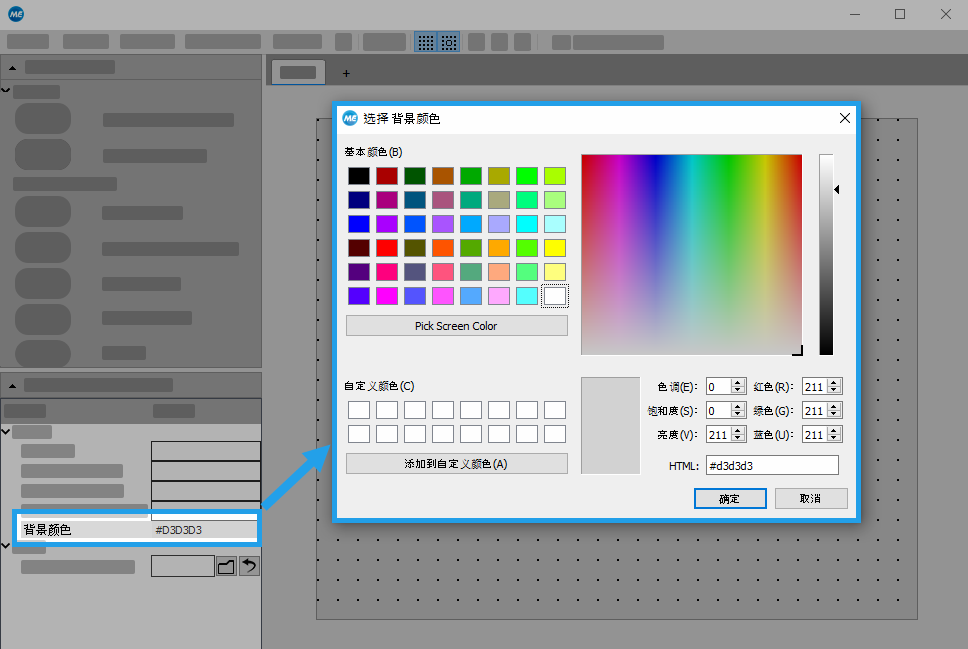 1. 单击“背景颜色”属性的输入字段,打开颜色选择对话框。