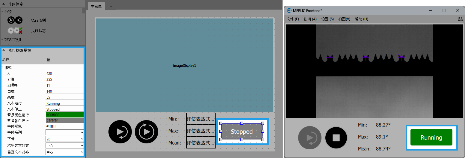 此小组件显示机器视觉应用程序的当前状态。如果想要在 Frontend 中显示应用程序当前是否正在运行,您可使用此小组件。