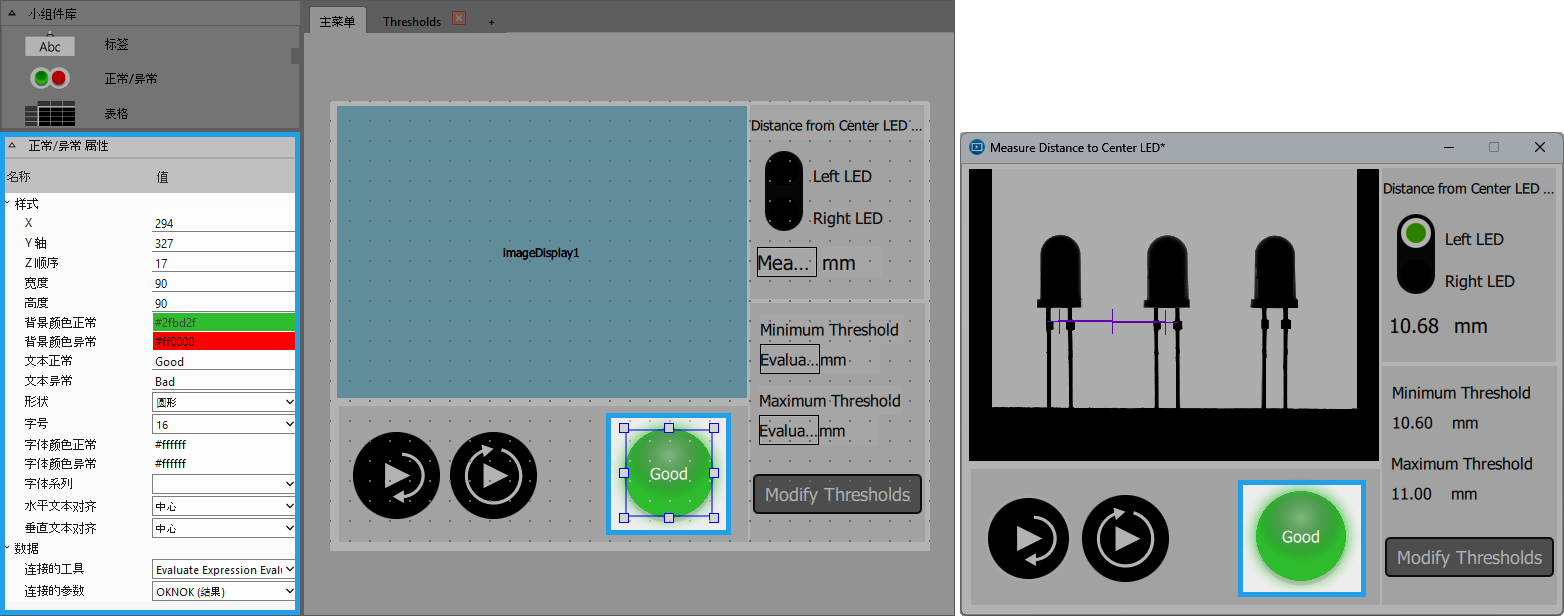 此小组件通过与值不为 0(“良”)或为 0(“差”)的结果相连,显示“良”或“差”状态。您可以为每种情况定义背景颜色和单独的文本。通过您预定义的属性可实现当前状态的可视化。