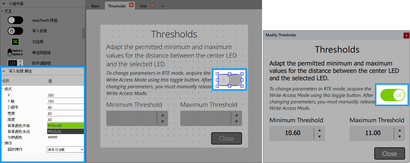为了满足在 MERLIC RTE 运行时需要允许在 MERLIC Frontend 中进行用户交互和修改的用例,您可以将“写入权限”小组件添加到 MVApp 的 Frontend 设计中。如果 MVApp 已进行相应的配置并以 MERLIC RTE 模式加载,则允许用户获取 MERLIC Frontend 中的写入权限。
