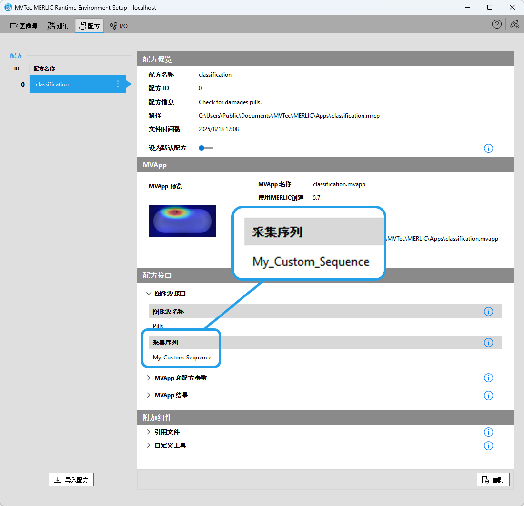 在 MERLIC RTE Setup 中导入配方后,被引用的序列将显示在“配方”选项卡中。