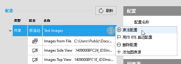 默认情况下,图像源配置处于非活动状态。这意味着图像源未连接,因此无法在 MVApp 中进行配置或使用。您必须确保首先激活包含您要使用的图像源的图像源配置。激活图像源配置后,才会建立起与图像源的连接,之后您便可以开始在 MVApp 中配置和使用这些图像源。