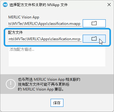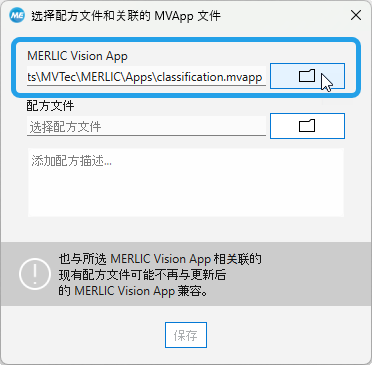 - 单击“保存”按钮,保存所选 MVApp 并创建文件后缀为“.mrcp”的配方文件。选择 MVApp 和配方文件后,将立即激活该按钮。