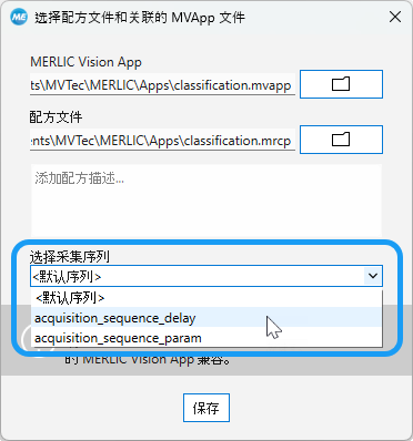 - 如果当前活动的图像源配置中有可用的采集序列,则可以使用额外的下拉菜单来选择采集序列。在 MERLIC RTE 模式下加载配方时,将自动激活所选的采集序列。要使用在 MERLIC RTE Setup 的“图像源”选项卡中设置为默认值的采集序列,请从下拉菜单中选择“<默认序列>”选项。有关更多信息,请参阅配置采集序列。