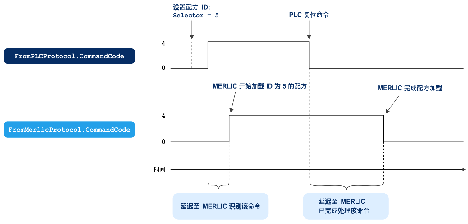 在以上示例中,成员 CommandCode 的值设置为 4。因此 MERLIC 识别命令 “PrepareRecipe”。应加载的配方文件在成员 Selector 中定义。在我们的示例中,应准备 ID 为 5 的配方并加载到 MERLIC。