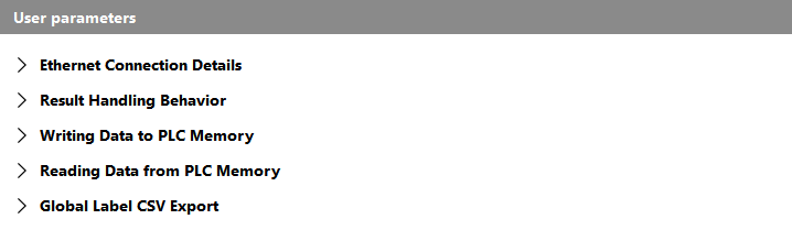 Die Parameter in dieser Kategorie definieren den Speicherort und den Namen der „Global Label“-Datei, die beim Starten des Plugins exportiert wird. Die Datei hängt von der jeweiligen Konfiguration des Plugins ab und enthält die globalen Labels aller Felder, die von der SPS reserviert werden sollen. Sie enthält einige Standardlabels, die immer exportiert werden, z. B. das Label zum Anfordern von Befehlen, und auch die Labels für die Anzahl der Ergebnisse und Iterationsparameter, die in der Konfiguration des Plugins definiert sind.