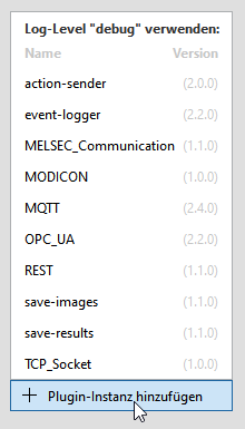 Wenn Sie die Log-Ebene „debug“ für ein Plugin verwenden möchten, können Sie die grafische Benutzeroberfläche des MERLIC RTE Setups verwenden. Beim Hinzufügen einer neuen Instanz des Plugins über die Schaltfläche „Plugin-Instanz hinzufügen“ auf der Registerkarte „Kommunikation“ des MERLIC RTE Setups können Sie die ALT-Taste drücken, während Sie das Plugin auswählen. Das Plugin wird dann mit der Log-Ebene „debug“ gestartet.