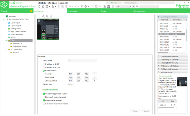 - Open the Ethernet configuration tab of your project in "EcoStruxure™ Machine Expert - Basic" and go to the "ETH1" configuration. The following image shows an example configuration of a Schneider Electric Modicon®* TM221CE16T PLC.