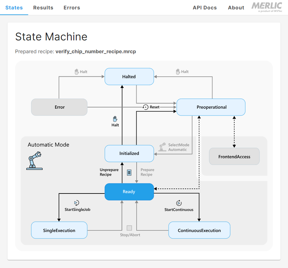 内置 web 应用程序的“States”页面可让您监视 MERLIC RTE 的当前状态并通过触发操作对其进行控制。它显示状态机的简化图形,包括所有 MERLIC 状态和状态之间的转换。该图形是交互式的,具有不同的用途: