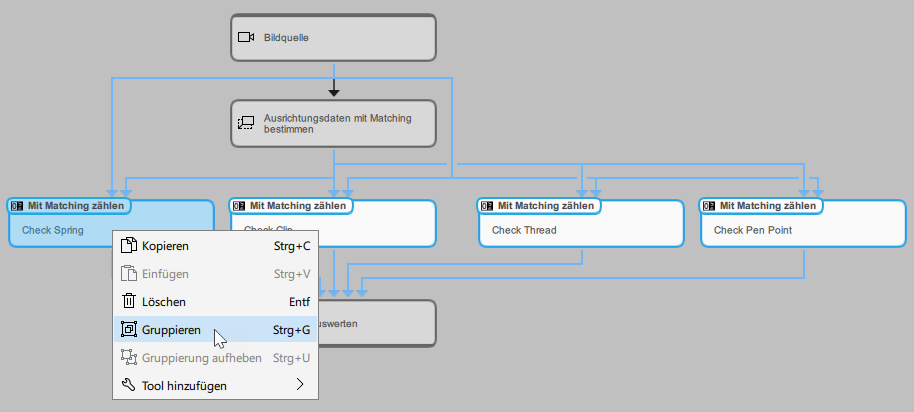 Gruppieren“ aus. Alternativ können Sie die Tastenkombination Strg+G verwenden. Wenn es nicht möglich ist, die ausgewählten Tools aufgrund von Einschränkungen zu gruppieren, ist der Kontextmenüeintrag ausgegraut und die Tastenkombination ist nicht verfügbar.