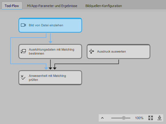 Im Tool-Flow-Panel wird eine Übersicht über alle Tools angezeigt, die in der MERLIC-Vision-App Eine MERLIC-Vision-App stellt eine in MERLIC erstellte Bildverarbeitungsanwendung dar. Sie besteht aus den Tools im MERLIC Creator, den Designer-Widgets und allen Einstellungen, die in der Anwendung verwendet werden. verwendet werden. Darüber hinaus werden vorhandene Verbindungen zwischen Tools visualisiert.