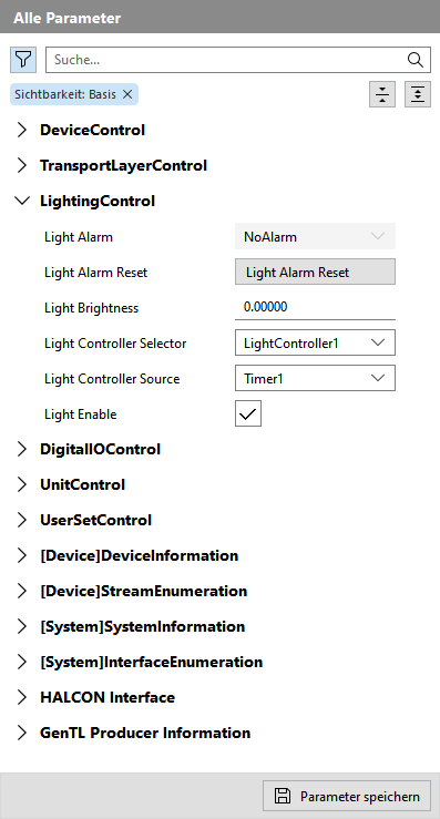 Die Parameter des Peripheriegeräts befinden sich auf der rechten Seite im Abschnitt „Alle Parameter“. Dort werden alle Parameter angezeigt, die für das jeweilige Gerät verfügbar sind.