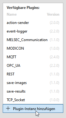- Wählen Sie das gewünschte Plugin aus, um eine neue Instanz des Plugins für die Konfiguration hinzuzufügen. Die Plugin-Instanz wird jetzt in der Liste oben links angezeigt.