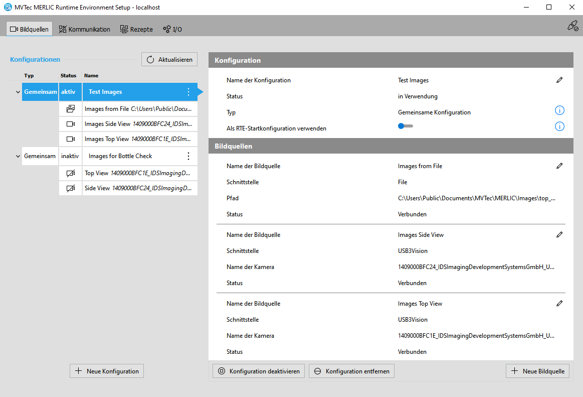 Es gibt verschiedenartige Konfigurationen: gemeinsame Konfigurationen und MVApp-spezifische Konfigurationen. Der Zustand einer Konfiguration bestimmt, ob die jeweiligen Bildquellen angepasst und in einer MVApp verwendet werden können. zuweisen, d. h. einer Gruppe von Bildquellen.