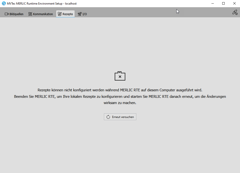 Wenn Sie Ihre Rezeptdateien auf der Registerkarte „Rezepte“ verwalten oder Kommunikationseinrichtungen konfigurieren möchten, für die MERLIC integrierte Plugins bereitstellt, z. B. für eine Hilscher card, darf der Prozessintegrationsmodus von MERLIC, d. h. das MERLIC RTE, nicht aktiv sein. Andernfalls ist kein Zugriff auf die Rezepte und Konfigurationsoptionen möglich. Dadurch wird sichergestellt, dass die Konfiguration für das MERLIC RTE während der Verarbeitung nicht geändert wird.