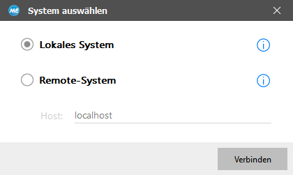 Wenn Sie das MERLIC RTE Setup direkt über den MERLIC Creator starten, wird eine Verbindung zum lokalen System hergestellt. Sie können jedoch zu einem Remote-System wechseln. Weitere Informationen finden Sie unter Wechseln zu einem anderen System.