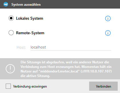Wenn ein anderer Benutzer eine Verbindung zu dem System erzwingt, mit dem Sie derzeit verbunden sind, wird Ihre Sitzung beendet, sodass die Konfiguration nicht fortgesetzt werden kann. Alle nicht gespeicherten Änderungen gehen verloren. In diesem Fall wird das Dialogfeld „System auswählen“ mit einer entsprechenden Meldung angezeigt. Sie haben die Möglichkeit, eine Verbindung zum jeweiligen System zu erzwingen, indem Sie das Kontrollkästchen „Verbindung erzwingen“ aktivieren und auf „Verbinden“ klicken. Der Benutzer, der zuvor verbunden war, erhält dann ebenfalls die Meldung, dass die Sitzung des Benutzers abgelaufen ist.