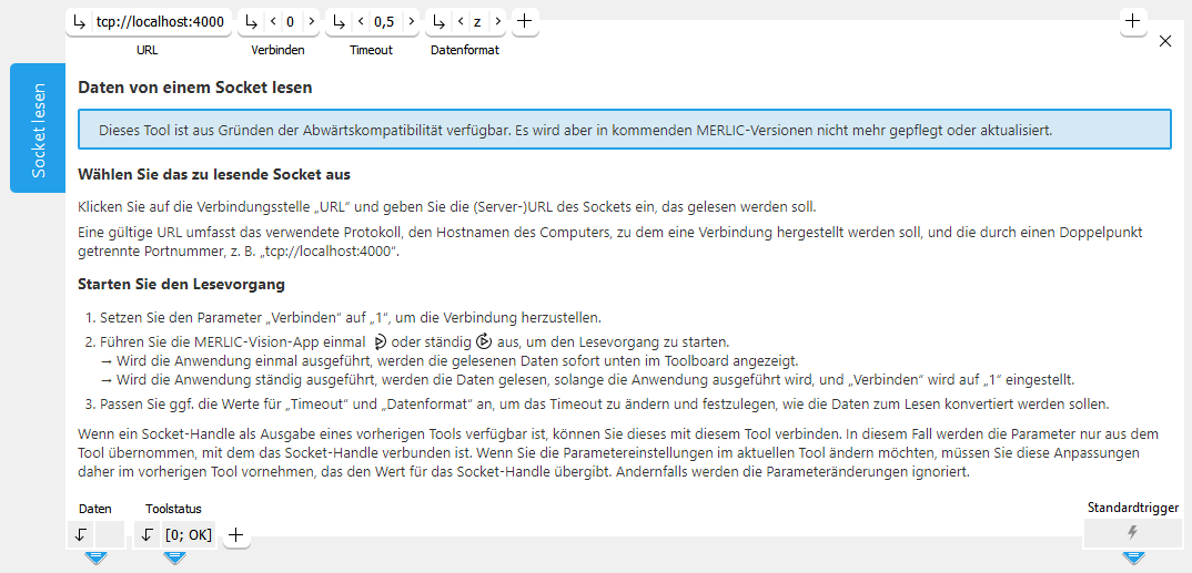 Bei einer „Socket-Handle“-Verbindung von einem vorherigen Socket-Tool werden alle Parameter nur aus dem ersten Tool übernommen. Wenn Sie also die Parametereinstellungen im aktuellen Tool ändern möchten, müssen Sie diese Anpassungen im ersten Tool vornehmen, da ansonsten die Parameteränderungen ignoriert werden.