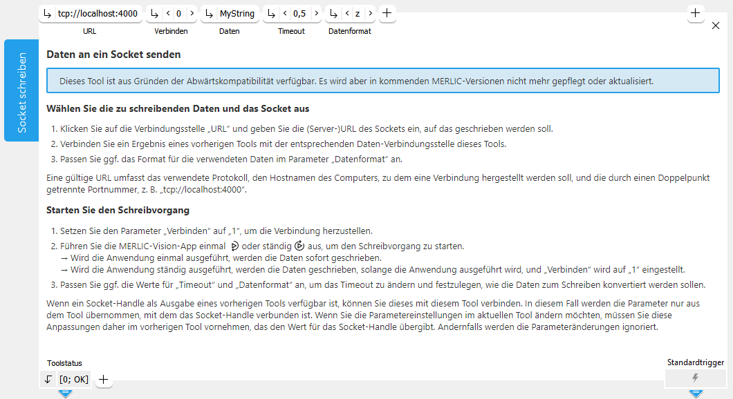 Dieser Parameter enthält die Daten, die in das Socket geschrieben werden. Er enthält standardmäßig den String „MyString“. Die Daten können als ganzzahliger Wert, reeller Wert oder Zeichenfolgewert dargestellt werden. Es ist auch möglich, die Daten als Tupel zu senden. Wenn Sie das Ergebnis eines vorherigen Tools schreiben möchten, können Sie Parameter mit dem jeweiligen Ergebnis der vorherigen Tools verbinden. Die verbundenen Daten werden in das Socket geschrieben.