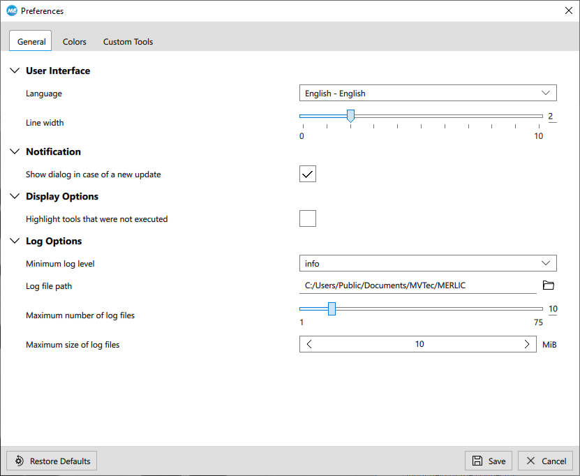 MERLIC provides a logging mechanism that automatically writes log messages to the respective log files in the default directory %LOCALAPPDATA%\MVTec\MERLIC\. To access the log files from the MERLIC Creator, you can use the menu entry "Help → Open Log File Directory".