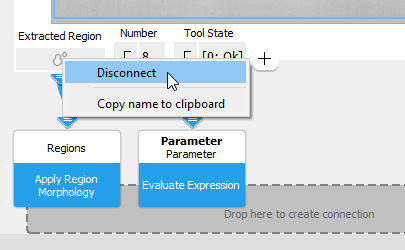 The data connections between an image parameter and an image result from a previous tool in the Tool Flow are created automatically whenever a tool is inserted but not when a copied tool is pasted. MERLIC checks whether a result of a previous tool represents an image and if the inserted tool contains an image connector. If this is the case, the image result of the previous tool is connected automatically to the image connector of the inserted tool.