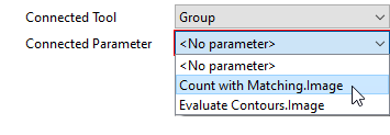2. Select the tool parameter or result whose values you want to transfer from the drop-down list of the property "Connected Parameter". The list contains all tool parameters and results of the tool that has been selected in the property "Connected Tool".