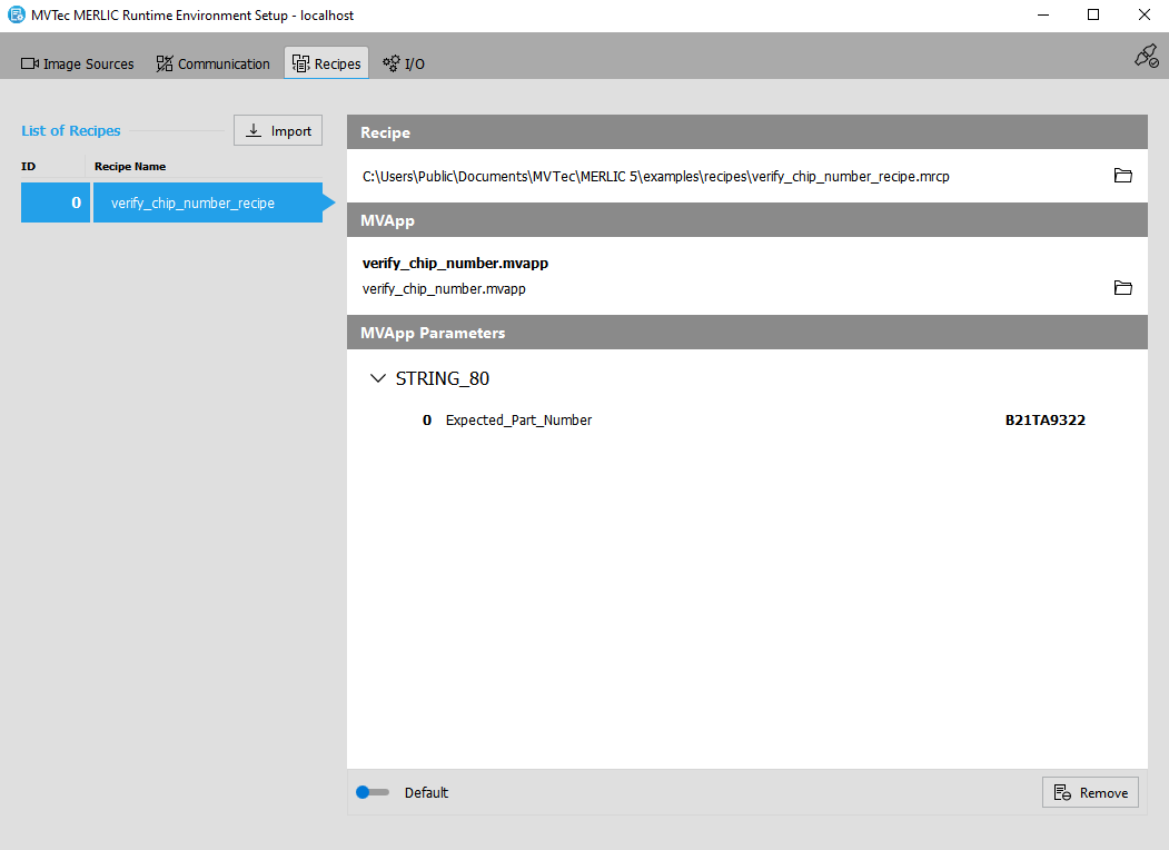 This section describes how to import or remove recipe files A MERLIC recipe file is a crucial part for the MERLIC process integration. It is a separate file (with file ending .mrcp) that defines which MERLIC Vision App is loaded for the process integration. It also defines how the MVApp is parametrized because it contains a set of pre-defined input values for selected tool parameters. You can create multiple recipe files with individual sets of input values for one and the same MVApp. This enables you to reuse an MVApp with different parameter settings for various scenarios of your application. You can also use a recipe file to load an MVApp for a completely different image processing task. to or from the "Recipes" tab, change their ID, and set default recipes. Recipes that have not been imported to the "Recipes" tab are not available for the MERLIC process integration MERLIC can be used in machine vision systems that are integrated in a manufacturing machine. The machine controller, e.g., a programmable logic controller (PLC), must be able to control an integrated vision system, to monitor the execution, and to query the results. Therefore, MERLIC provides a process integration mode to enable the communication with a machine controller. The process integration mode can be started with the application "MERLIC RTE" that is provided with the MERLIC installation.. Therefore, it is mandatory to import the desired recipes before starting MERLIC in process integration mode. For more information about creating recipes refer to the topic Creating a MERLIC Recipe.