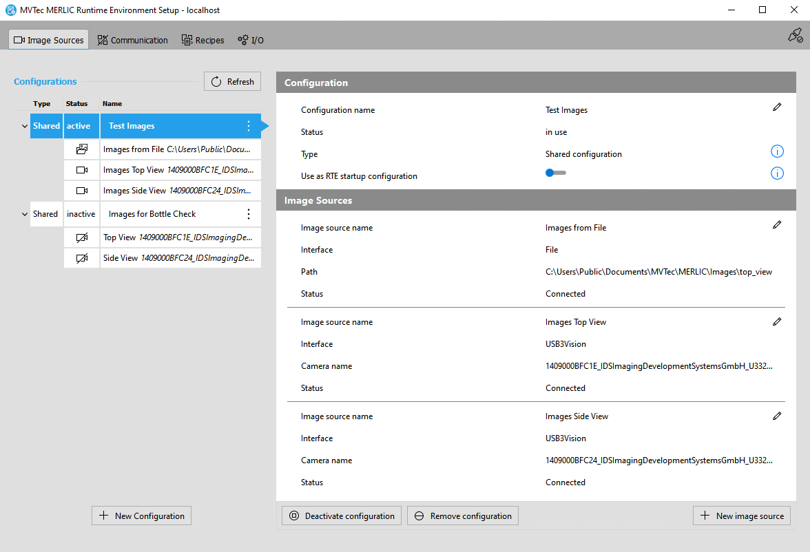 The " Image Sources" tab of the MERLIC RTE Setup represents the graphical user interface for the configuration of image sources for the image acquisition via the Image Source Manager. It allows you to configure image sources independently from a MERLIC Vision App. You can set up different types of image sources such as camera devices, image directories, or peripheral devices, for example, lighting controllers. When using the Image Source Manager for the image acquisition, you have to assign each image source to a specific image source configuration An image source configuration represents a set of image sources of the Image Source Manager. Each image source must be assigned to a specific configuration. It is not possible to add an image source without a configuration. Therefore, you first have to add a configuration for a new image source in the "Image Sources" tab of the MERLIC RTE Setup or you have to add the image source to an existing configuration.