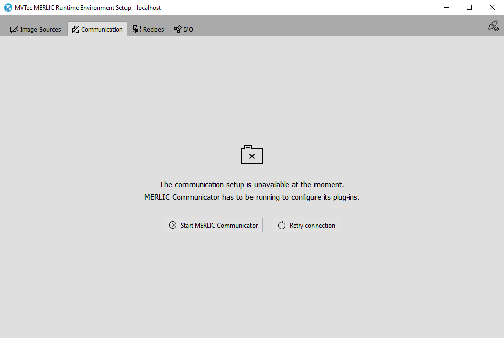 In some cases, the connection to the selected system or the current service in the MERLIC RTE Setup, e.g., the "Communication" tab, might be lost and you have to reconnect to the system or start the required MERLIC application to continue the configuration. Depending on the cause of the disconnection, different actions might be necessary to restore the connection. In the following, we list the most common use cases for the respective tabs in the MERLIC RTE Setup.