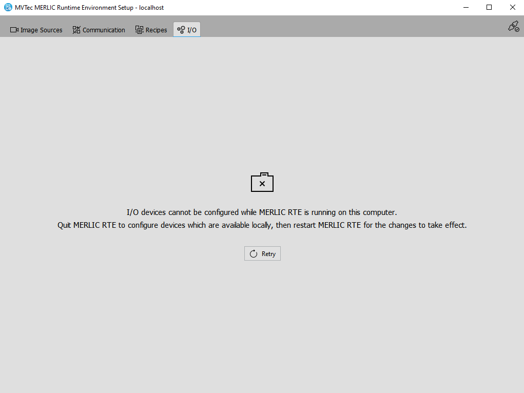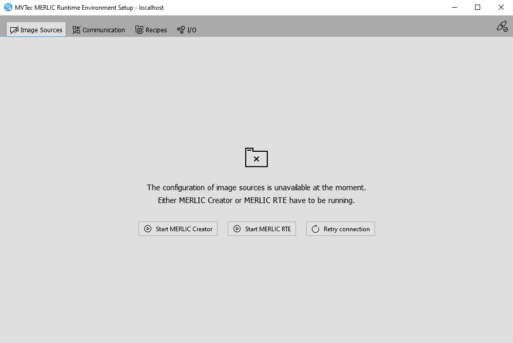 If you start the applications outside of the MERLIC RTE Setup, for example, via the Windows start menu, you can also use the button "Retry connection" to reconnect to the respective configuration service. This might be necessary in case you are connected to a remote system. However, all unsaved changes at the image source configurations will be lost when the configuration service is lost.