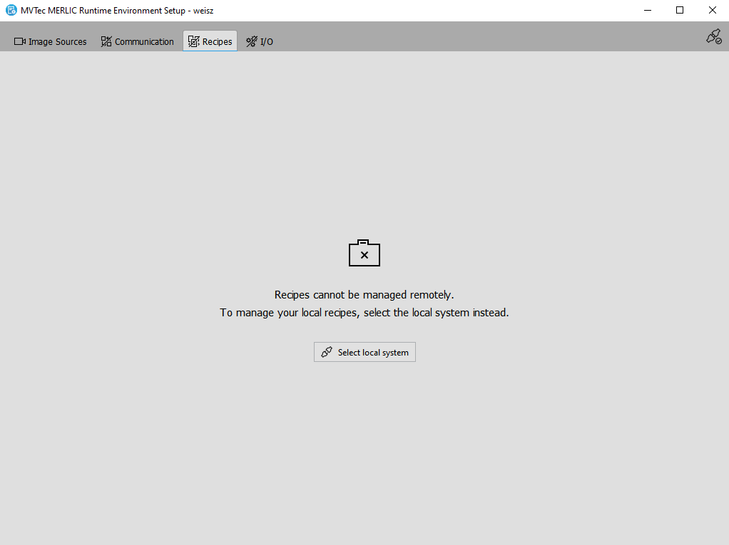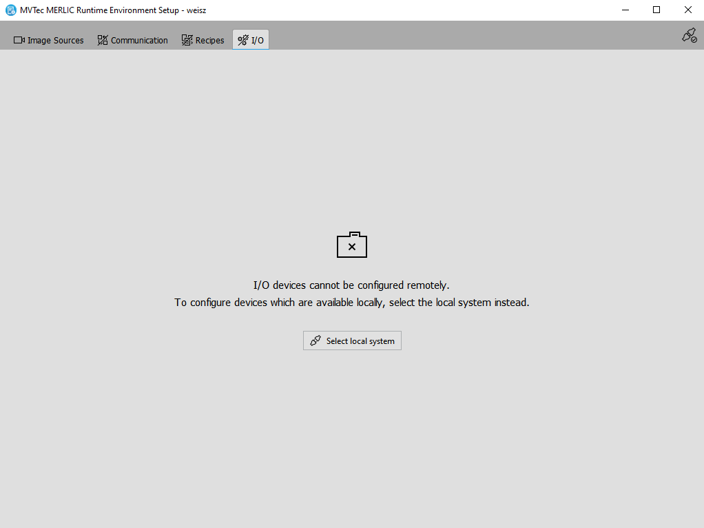 If you are connected to a remote system with the MERLIC RTE Setup, the "Recipes" and "I/O" tab will not be available. The configuration options of these tabs are only available for recipes and communication devices on the local system. In contrast to Communicator plug-ins which can be configured remotely, the communication devices for which MERLIC provides built-in plug-ins can only be configured on the local system.