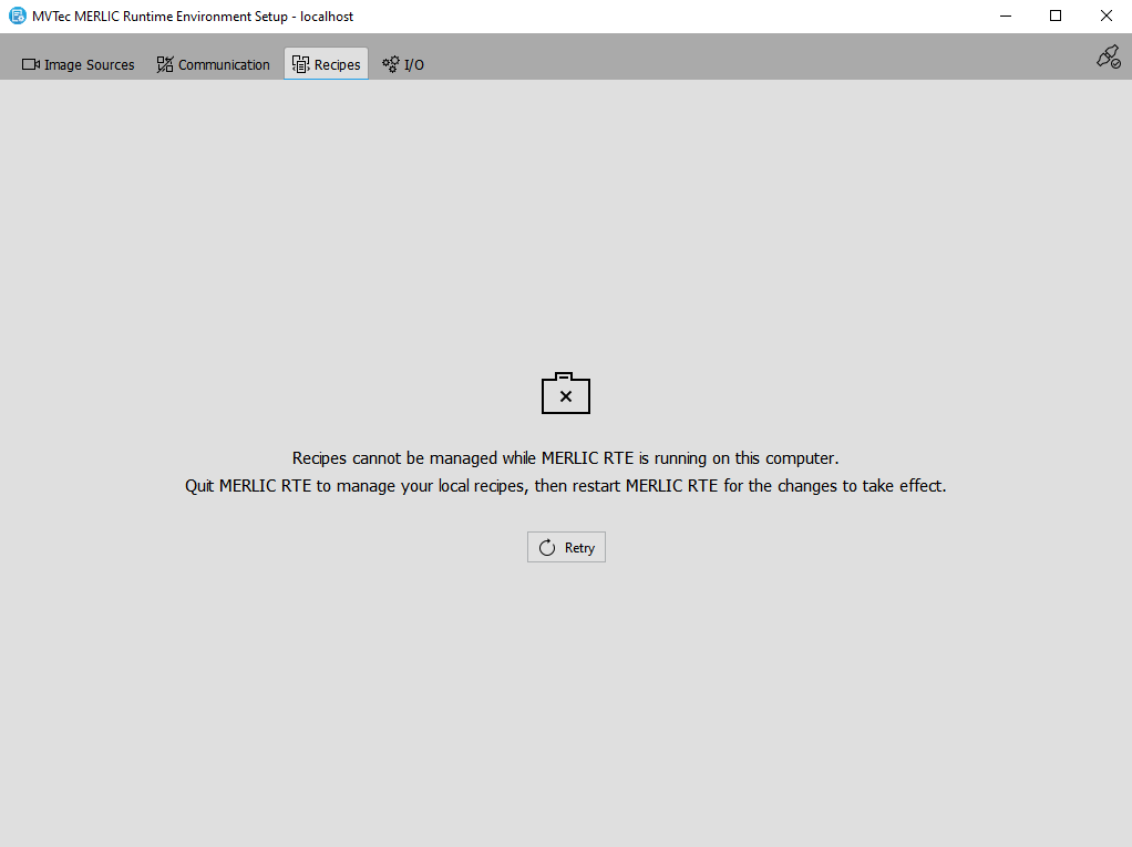 If you want to manage your recipe files in the "Recipes" tab or if you want to configure communication devices for which MERLIC provides built-in plug-ins, e.g., Hilscher card, you have to ensure that the process integration mode of MERLIC, i.e., MERLIC RTE, is currently not running. Otherwise, the recipes and the configuration options cannot be accessed. This ensures that the configuration for MERLIC RTE is not changed during the processing.