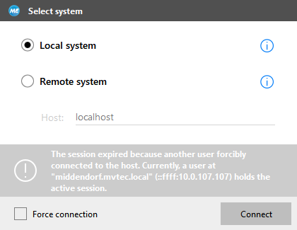 In case another user forces a connection to the system to which you are currently connected, your session will be expired and the configuration cannot be continued. All unsaved changes will be lost. In this case, the "Select System" dialog is displayed with the respective message. You have the possibility to force the connection to the respective system by checking the "Force connection" check box and clicking on "Connect". Then the user who previously held the connection will receive the same message that the user's session expired.