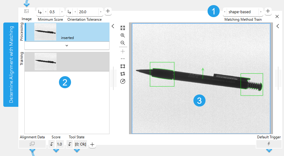 For this the tool provides a training area on the left of the Tool Board. It enables you to change between the processing mode to search and the training mode to train the alignment data by clicking on the respective image. The graphics window will display the image of the currently active mode which is highlighted in blue in the training area. In addition to the search parameters on the top left, the tool provides further parameters for the training on the top right of the tool.