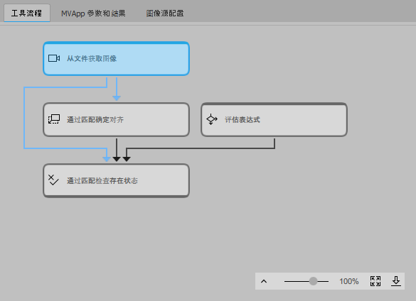 工具流程面板显示 MERLIC Vision App MERLIC Vision App 是在 MERLIC 中创建的图像处理应用程序。它包括MERLIC Creator 中的工具、Designer 小组件以及在应用程序中使用的所有设置。 中使用的所有工具的概览。此外,还会显示工具之间的现有连接。