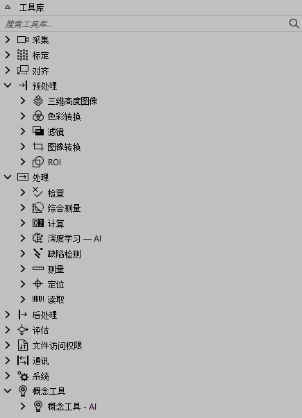 工具按类别进行划分,这些类别大致代表了典型机器视觉应用程序的步骤。请参阅 MERLIC 工具参考,了解关于提供的 MERLIC 工具的更多信息。