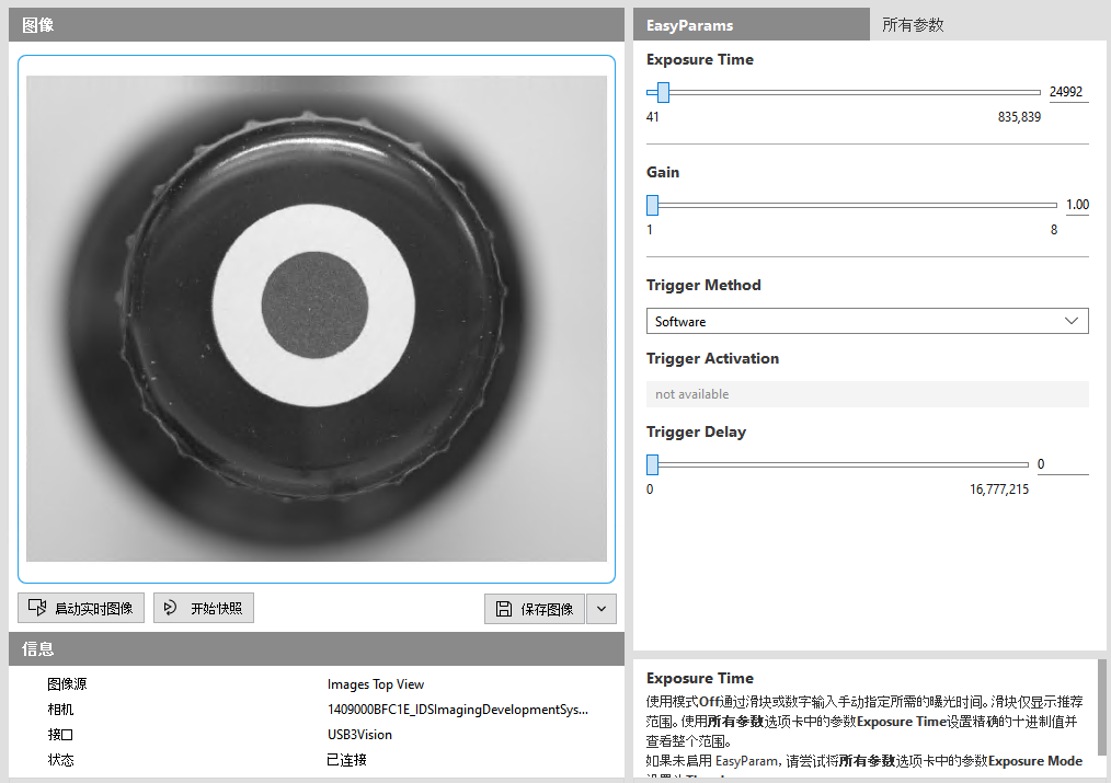 在下文中,您可以详细了解图像预览、在何处查找所选相机的更多信息以及如何重新连接相机。有关提供相机参数的“参数”部分以及用于调整参数设置的不同选项的更多信息,请参阅调整相机参数主题。