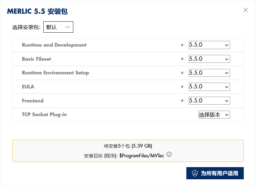 如果为所有用户安装 MERLIC,则默认安装到目录“%PROGRAMFILES%\MVTec\MERLIC-5.5”中。