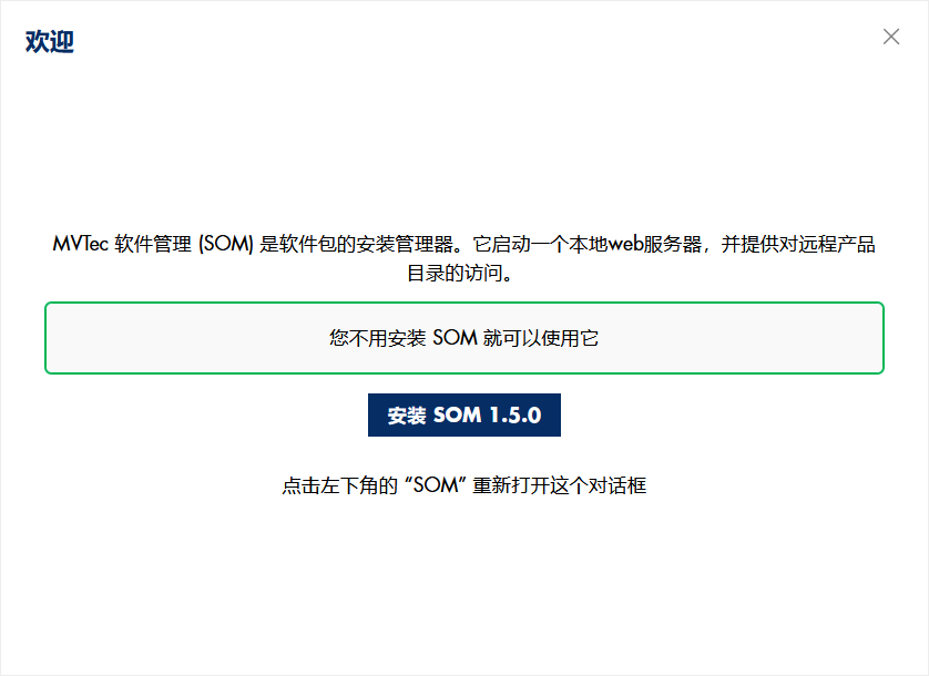 如果您想安装 SOM,单击“安装”按钮。如果您想稍后安装 SOM,但启动 SOM 时不再显示此对话框,可以通过单击浏览器窗口底部的“SOM 1.4”从 MVTec Software Manager 网站重新打开该对话框。