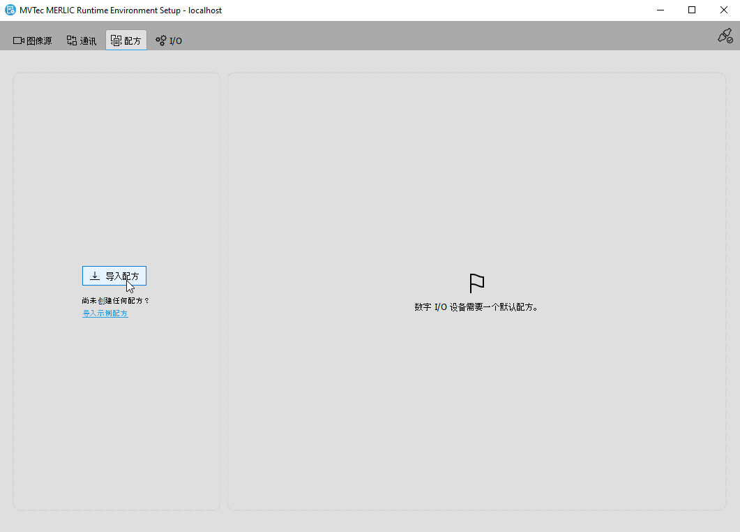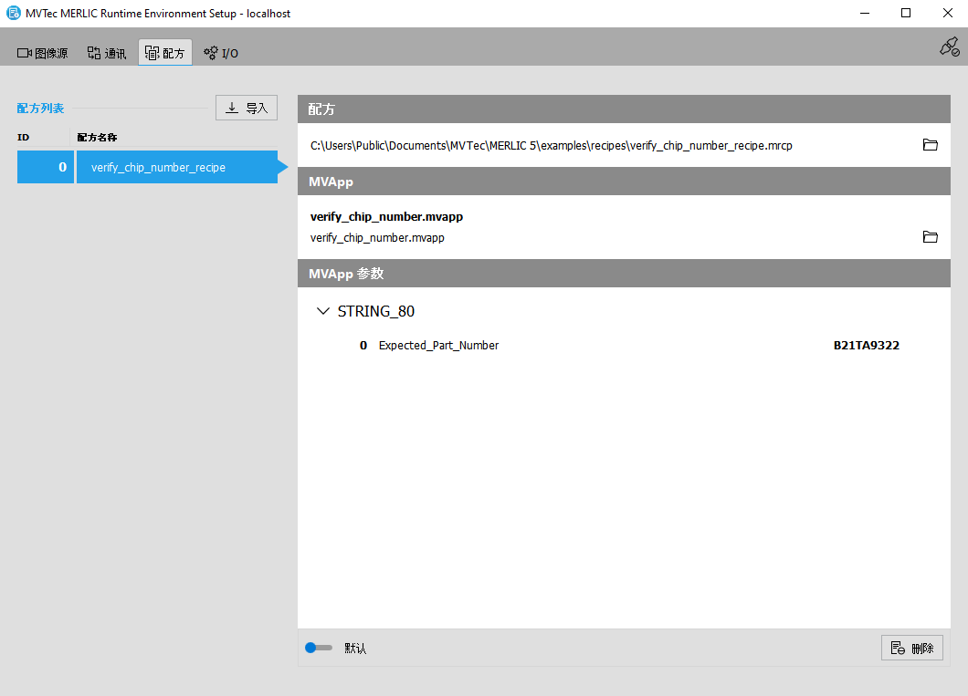 本部分介绍如何在“配方”选项卡中导入或删除配方文件 MERLIC 配方文件是 MERLIC 流程集成的关键部分。它是个单独文件(文件后缀为 .mrcp),定义了为流程集成加载哪个 MERLIC Vision App。它包含了一组预定义的输入值用于选定的工具参数,因此它还定义了参数化 MVApp 的方式。 您可以使用单个输入值集为同一个 MVApp 创建多个配方文件。这让您可以通过不同的参数设置将 MVApp 重复用于各种应用场景。您还可以使用配方文件加载 MVApp用于完全不同的图像处理任务。、更改其 ID 以及设置默认配方。未导入到“配方”选项卡的配方不可用于 MERLIC 流程集成 MERLIC 用于集成在制造机器中的机器视觉系统。机器控制器(例如,可编程逻辑控制器 [PLC])必须能够控制集成视觉系统、监控执行情况和查询结果。因此,MERLIC 提供了一个流程集成模式以支持与机器控制器的通信。 可使用应用程序“MERLIC RTE”在流程集成模式下启动,该应用程序随 MERLIC 安装一起提供。。因此,在流程集成模式下启动 MERLIC 之前必须导入所需的配方。有关创建配方的更多信息,请参阅创建 MERLIC 配方主题。