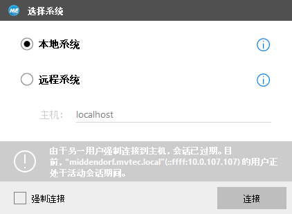 如果其他用户强制连接至您当前连接的系统,您的会话将过期且无法继续配置。所有未保存的更改都将丢失。在这种情况下,“选择系统”对话框将显示,并且其中会显示相应消息。您可以通过选中“强制连接”复选框并单击“连接”按钮来强制连接至相应的系统。之前保持连接的用户随后同样将收到用户会话已过期的消息。