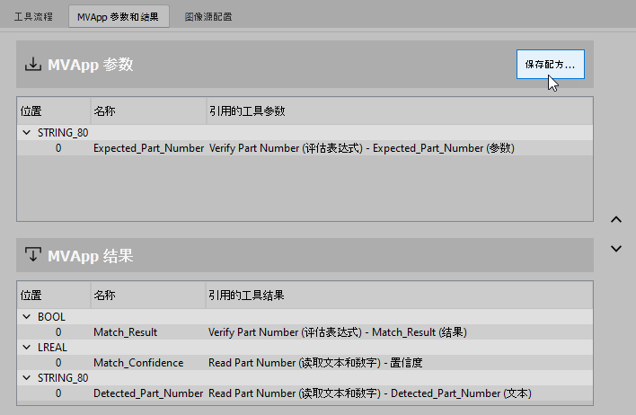 要为 MVApp 新建配方文件,需在中 MERLIC Creator 打开相应的 MVApp。如果要通过配方文件对 MVApp 中的特定工具参数进行参数设置,则必须首先定义相应的输入值,然后再按如下所述创建配方文件。有关 MVApp 参数及其定义方式的更多详情,请参阅 MVApp 参数 主题。如果您的应用程序不需要通过配方文件进行参数设置,则可以直接创建配方文件。