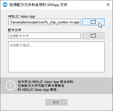 - 选择配方文件中应引用的 MVApp 文件。如果已在上一步中保存过 MVApp,则默认情况下其会被选中。您可以通过