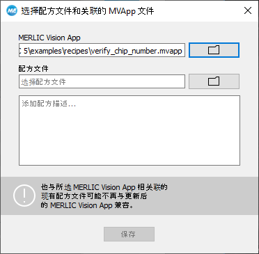 编辑配方文件与新建配方文件的过程非常相似。您可以在 MERLIC Creator 中与配方文件关联的 MERLIC Vision App 处执行更改,并根据需要调整 MVApp 参数: