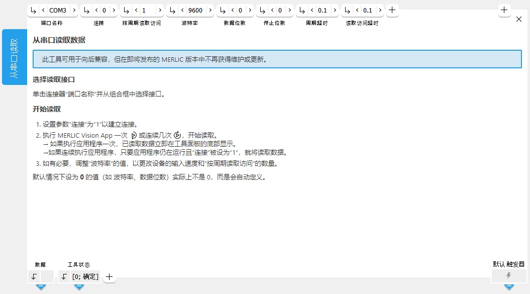 请确保该参数没有连接到不同 从串口读取 工具的句柄。这可确保所有数据都在此工具中读取。