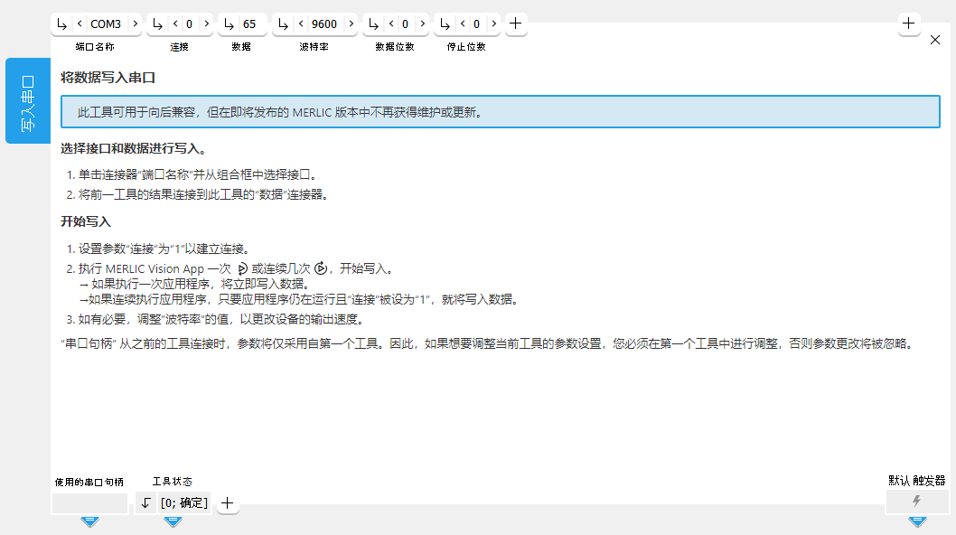 此参数可用于指定从前一工具“串口句柄”已定义写入数据的串口的句柄。如果设置“串口句柄”,则会从前一工具采用所有控制参数,例如,“端口名称”、“波特率”等。