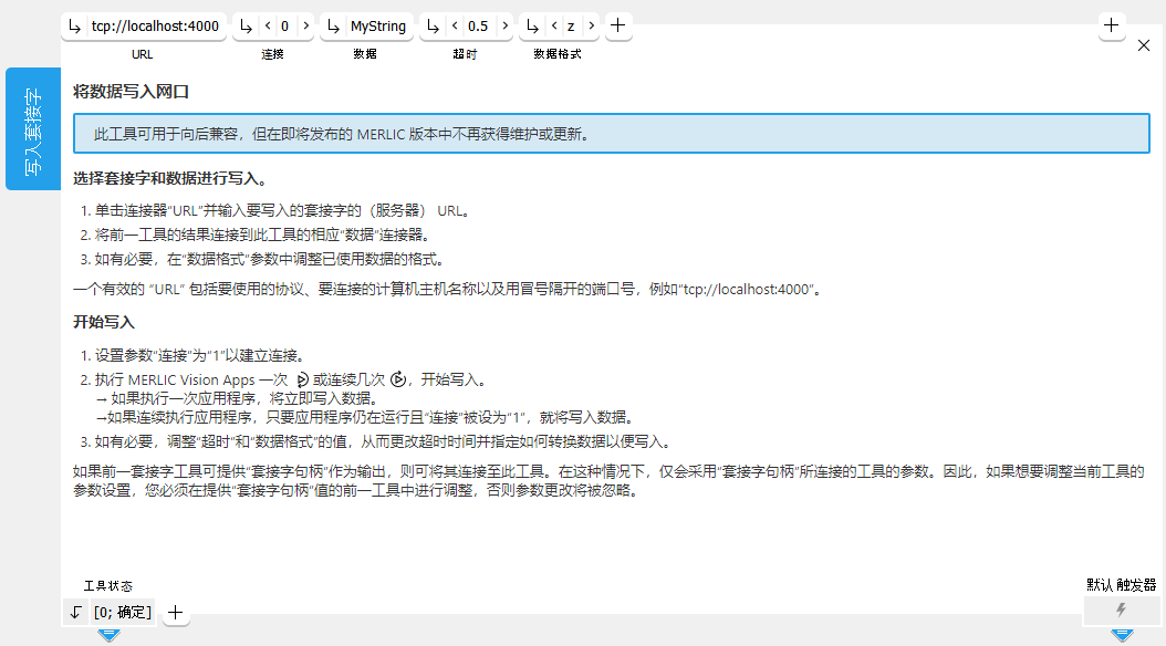 在“URL”参数中设置要写入的套接字,并通过将“连接”参数设为 1 建立连接。由于此工具会建立客户端连接,服务器必须可用。通过 按钮,您可以在单个步骤中执行此工具。这样让您可以逐步写入数据。