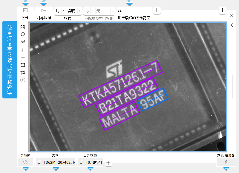 与现有的 MERLIC 工具读取文本和数字不同,此工具使用基于整体深度学习的光学字符识别 (OCR) 方法。它能更准确地定位字符,无论其位置、方向和字体类型如何。字符会自动组合,从而可以识别整个字。因此,可以避免误读外观相似的字符,并提高读取性能。