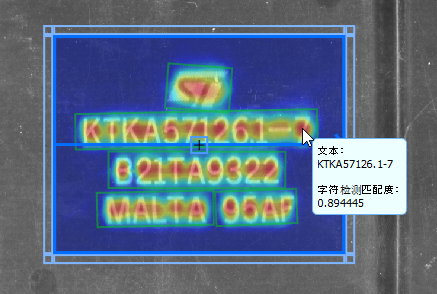 此结果表示处理图像和在参数“匹配度类型可视化”中选择的匹配度图的叠加。当处理图像通过匹配度图显示时,您可以更清楚地看到 Deep OCR 模型的检测组件分别检测到字符或字的位置。