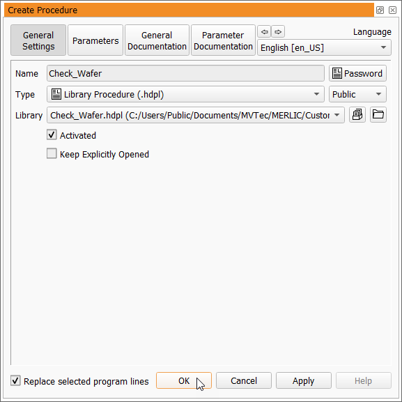 Open the drop down menu for the "Type" of the procedure and select "Library Procedure (.hdpl)". Now, the additional settings for procedure libraries will also be displayed.